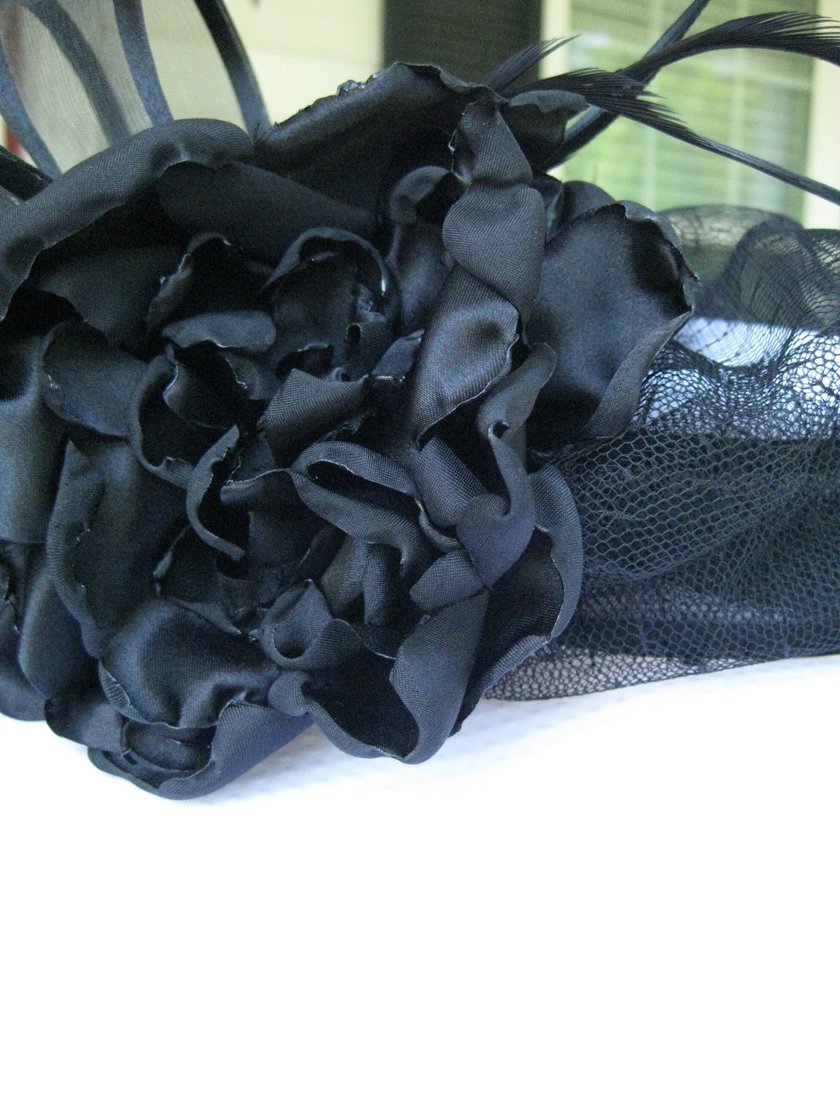 In this pic you can sort of see under the lacy netting where I took a sheer,wired, black ribbon and tacked it around the crown of the hat to hide the seam where it met the brim.